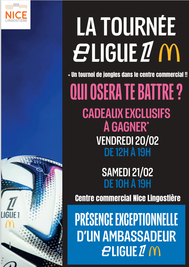 Le District de la Côte d’Azur de Football est heureux de soutenir la Tournée eLigue 1 McDonald’s, qui se tiendra les 20 et 21 février au Centre commercial Nice Lingostière.